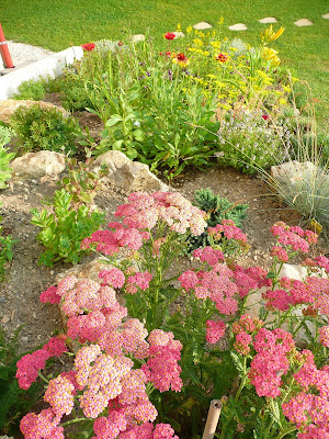 Achillées, gaillardes, santolines, hemerocalles, joubardes et sedums sont en fête actuellement.. Les plantations de ce printemps supporte la chaleur pour l'instant...