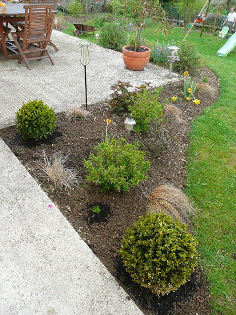 Du coup, on a pris le taureau par les cornes: on a pris les boules de buis qui étaient dans les pots de l'entrée pour les disposer dans le parterre. Un peu de structure et de persistant, c'est ce dont la terrsase a besoin! Marie Noelle ne me contredira pas hein???? (lol!)