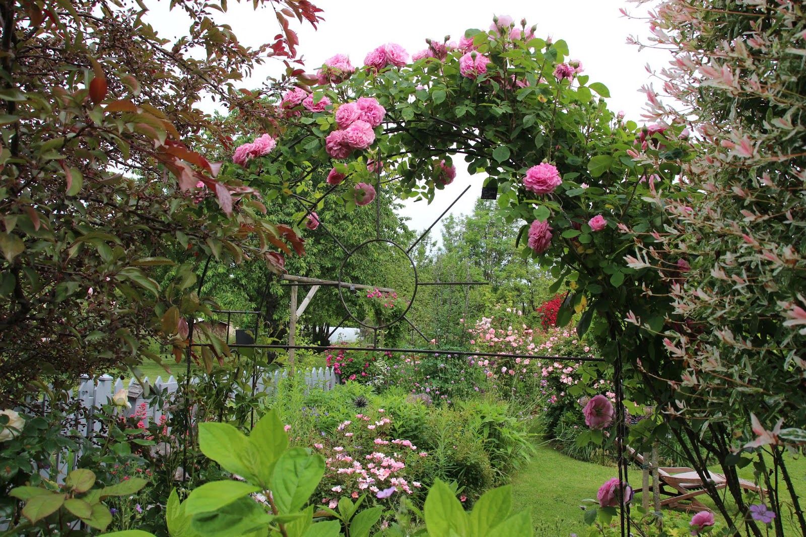 Sur l'arche, il y a le rosier adenochaeta puis à droite les rosier Grand duc Jean et Ballerina
